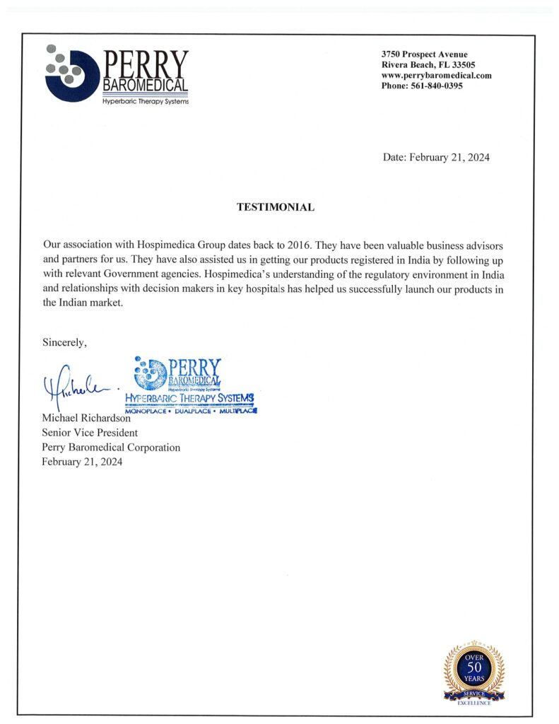 “Our association with Hospimedica Group dates back to 2016. They have been valuable business advisors and partners for us. They have also assisted us in getting our products registered in India by following up with relevant Government agencies. Hospimedica’s understanding of the regulatory environment in India and relationships with decision makers in key hospitals has helped us successfully launch our products in the Indian market.”